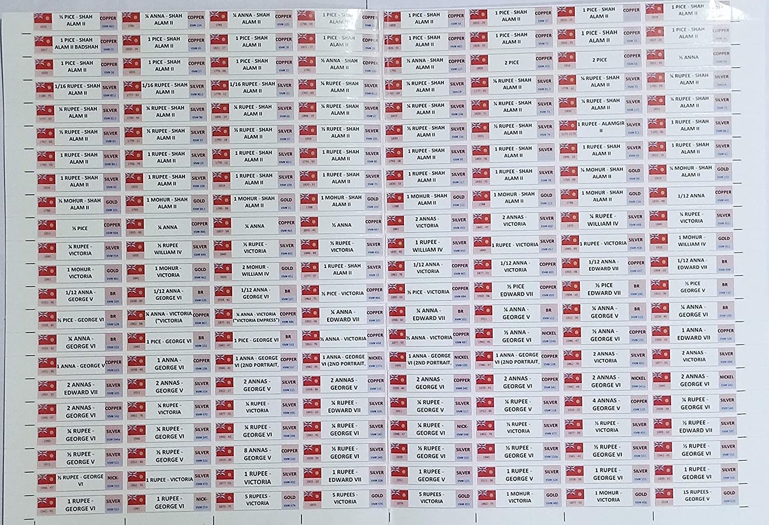 British India Silver, Copper & Gold Coin Stickers | 1600ā1947 | 360 Counts | 1 Chart ā RCI
