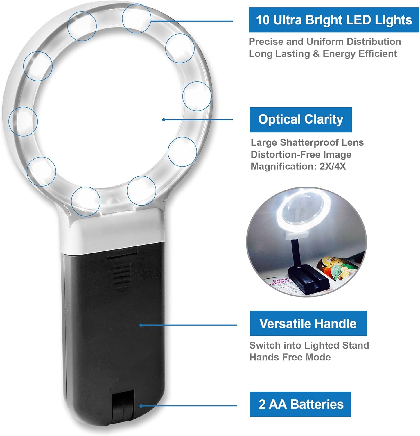 LED Lighted Hands-Free Magnifying Glass with Stand – 2X/4X Large Illuminated Magnifier for Reading, Inspection, Soldering, Needlework, Repairs, Hobbies & Crafts