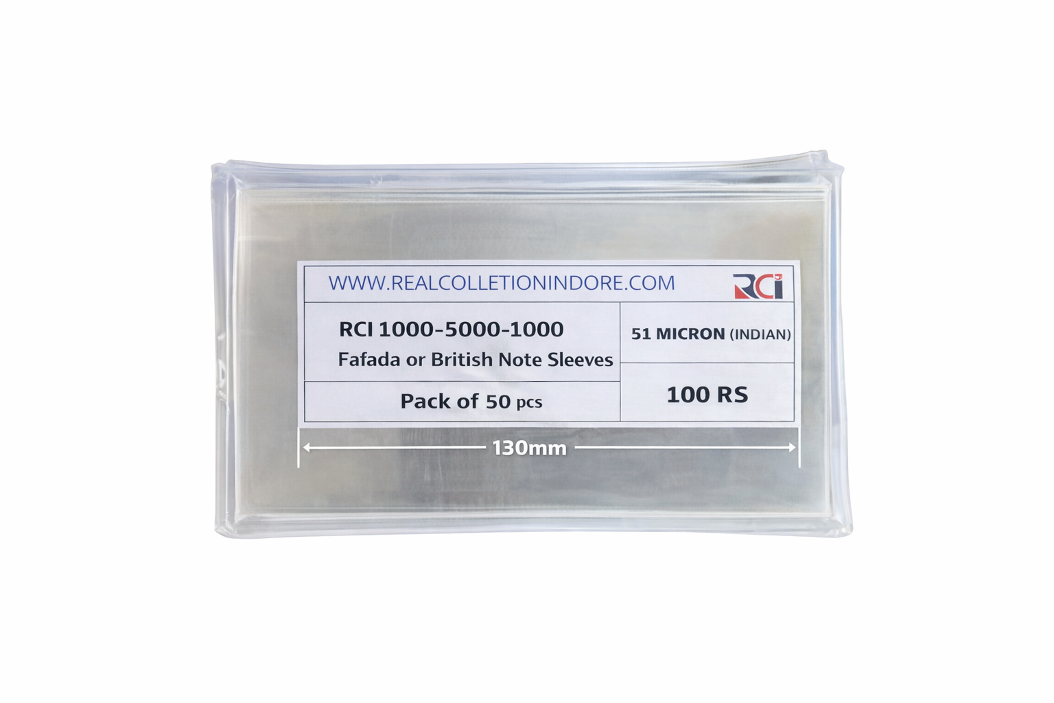 RCI Currency Note Sleeves – 500, 1000 & 2000 Rupee Notes (8×19cm) – Pack of 50