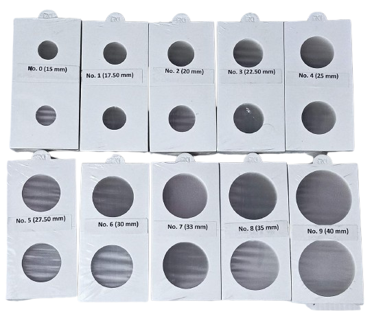 The RCI Coin Holders Set (15mm TO 40mm) is designed for coin collectors seeking a complete and organized storage solution. This set includes 11 different sizes, with 25 durable cardboard holders per size, totaling 275 pieces. Each holder features high-quality cardboard with a transparent window, allowing you to view both sides of your coins while keeping them protected from dust, scratches, and handling. PVC-free and archival-safe, these holders are ideal for hobbyists, collectors, and professional numismatists.